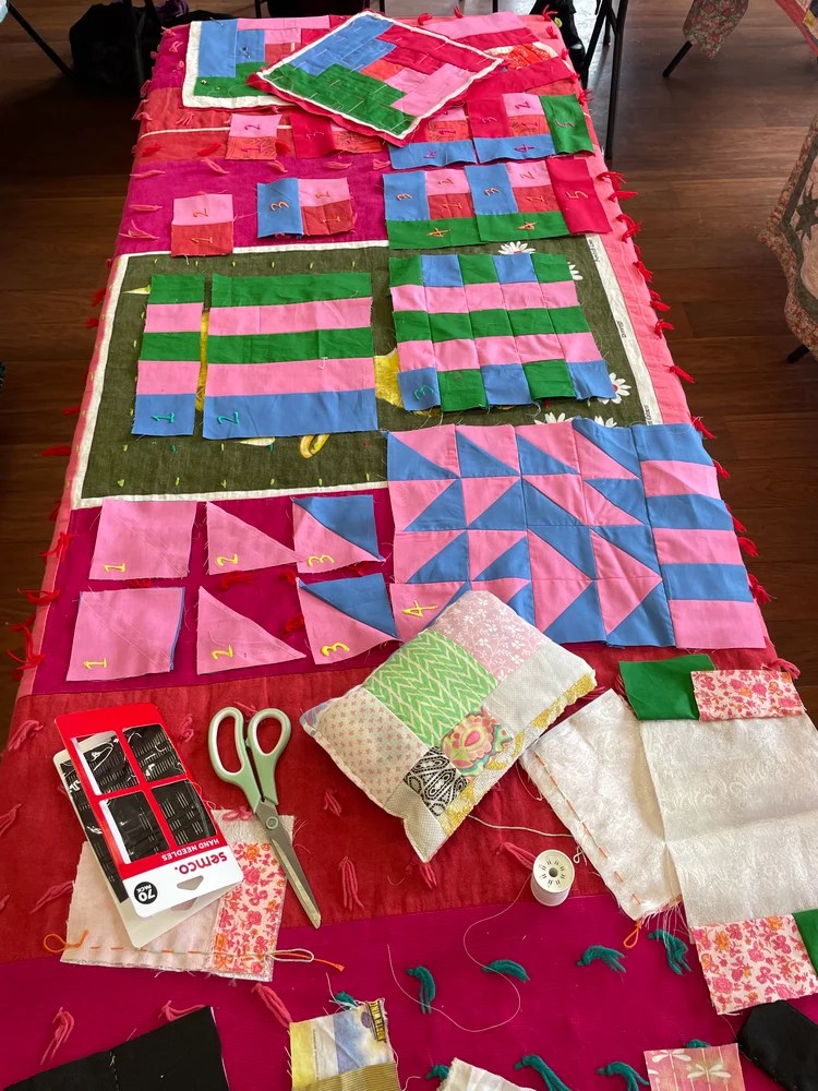 ❀ 10am – 12pm – Learning the basics of improv patchwork and making a mini patchwork – the centerpiece of our quilts!